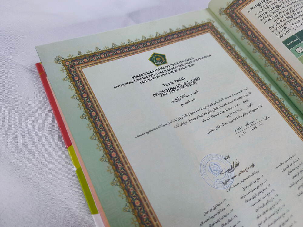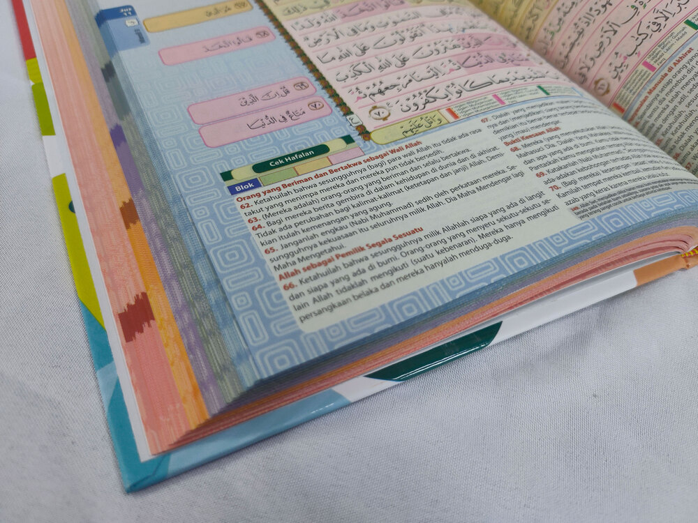 Ini adalah Mushaf Al-Qur’an yang didesain khusus untuk memudahkan hafalan dan muroja’ah. Ditulis dengan rasm Utsmani standar Indonesia, dilengkapi dengan metode hafalan TAKKA dan blok warna, juga dilengkapi dengan tampilan tajwid warna, awal ayat untuk hafalan, lanjutan ayat, indeks juz dan indeks manzil, serta ringkasan ilmu tajwid.